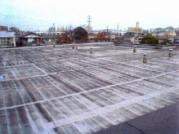 ゴムシート防水が、トップコートの減耗が見られます。 この場合、不良部分の点検とトップコートの塗布を行って対策をします。